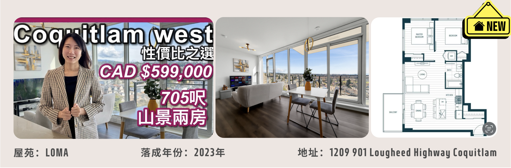 今次一起看看Coquitlam West的高層大樓Loma。這裡沒有Metrotown或Brentwood那種高樓林立的壓迫感,景觀開揚、環境清靜。同樣的預算在Metrotown只夠買一房,在這裡已可擁有兩房新樓。單位在12樓,705呎,兩房一廁,售價 $599,000。特色是:落地玻璃窗橫貫整個客廳,山景與天際線一覽無遺,更可遠眺Mount Baker雪山。車程五分鐘內可達大統華、IKEA、韓國城,生活方便。👉了解更多