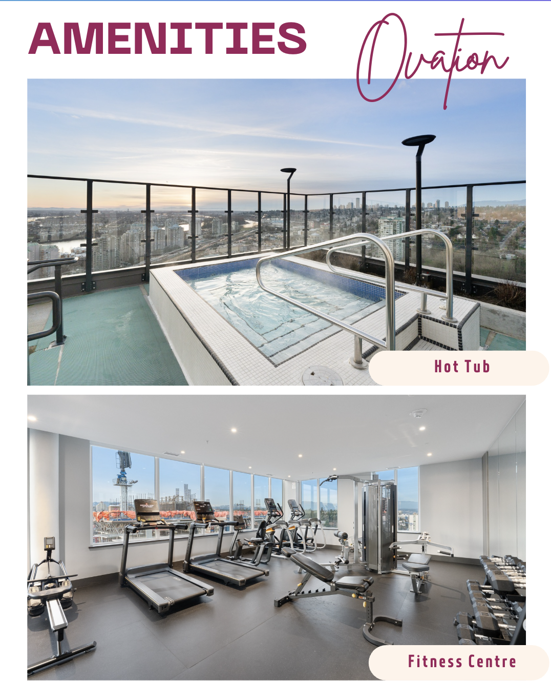 Ovation的會所設施包括:室外熱水池、健身室、Lounge、Concierge、室外BBQ等。